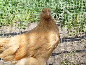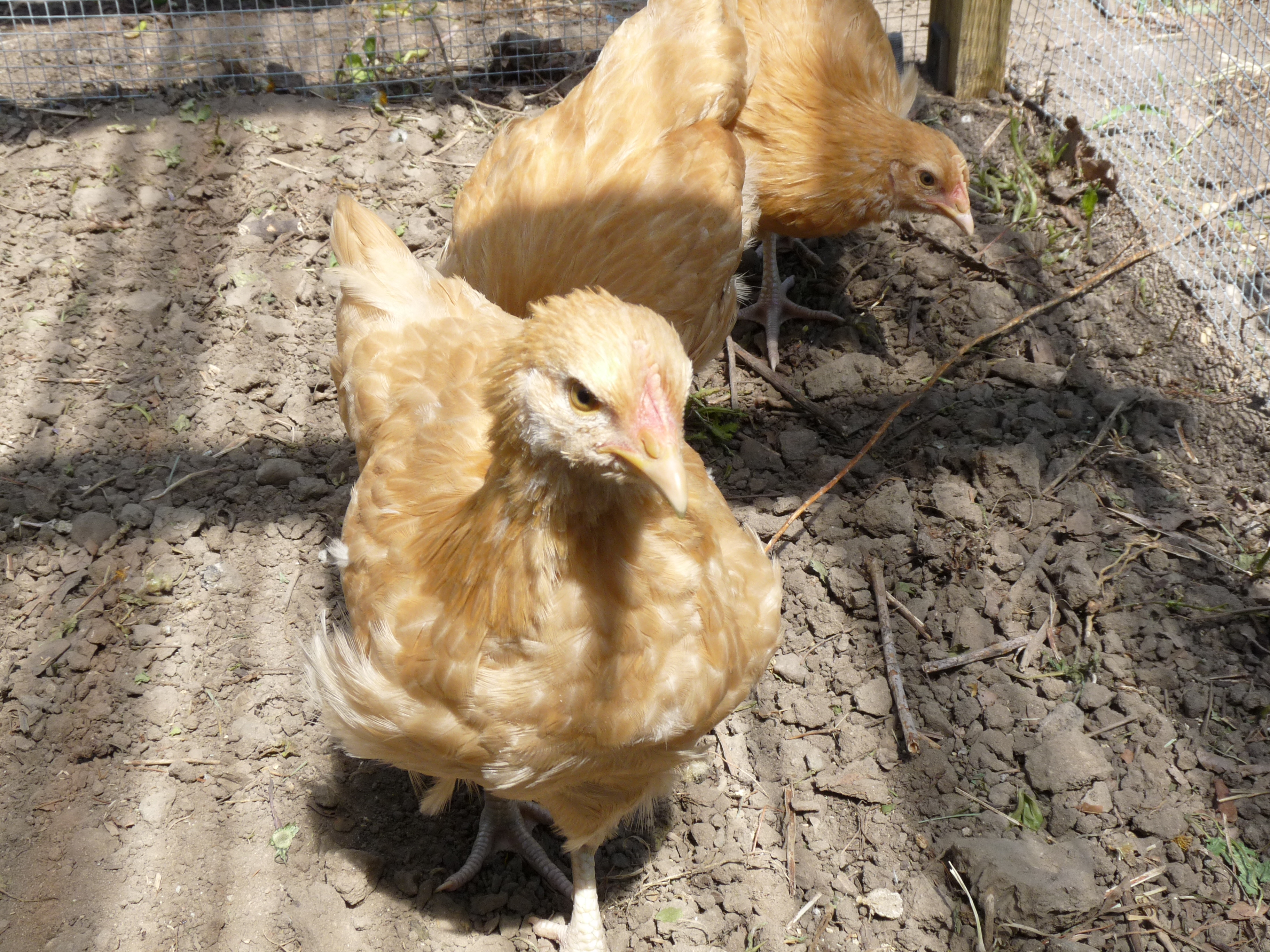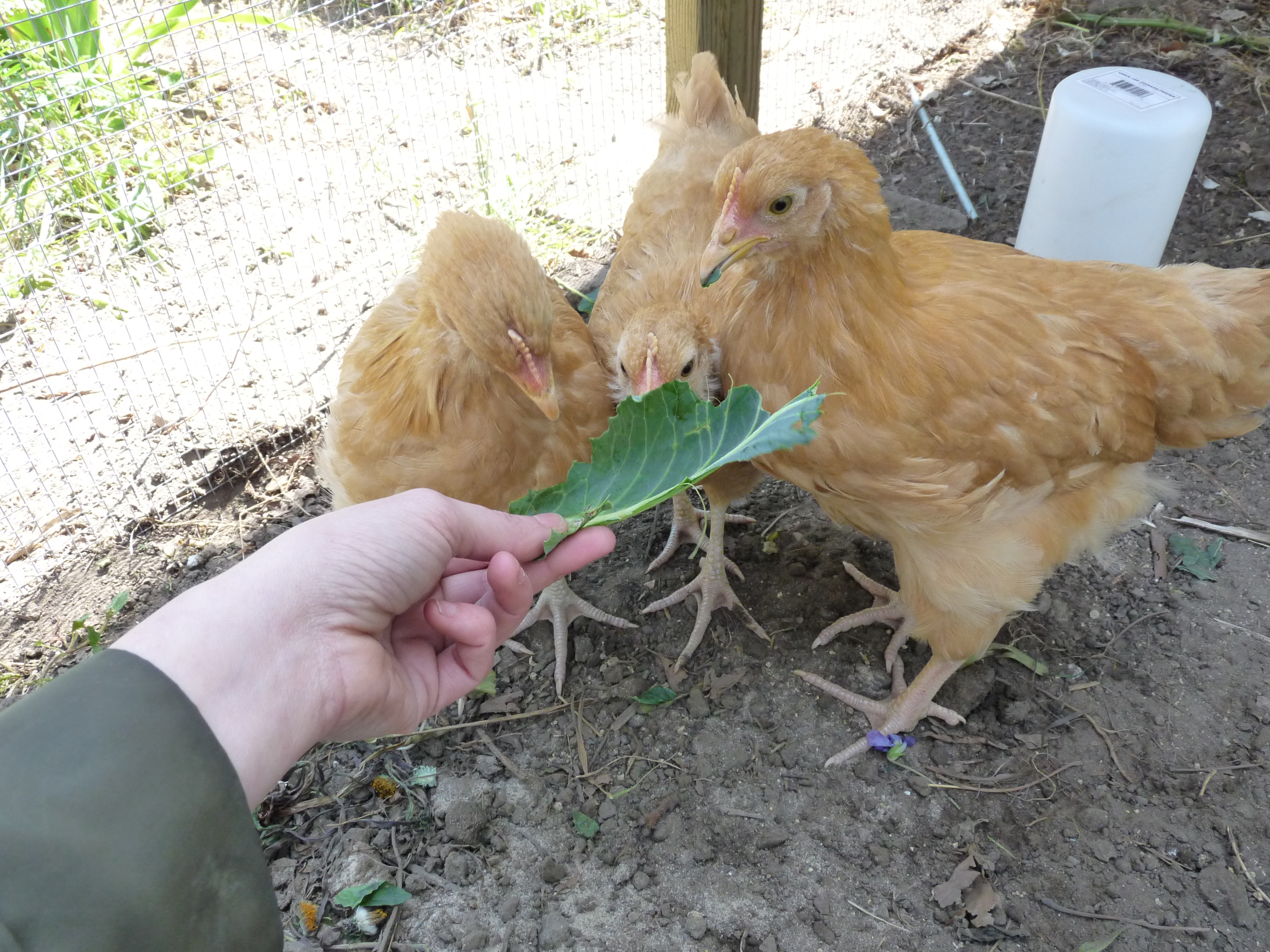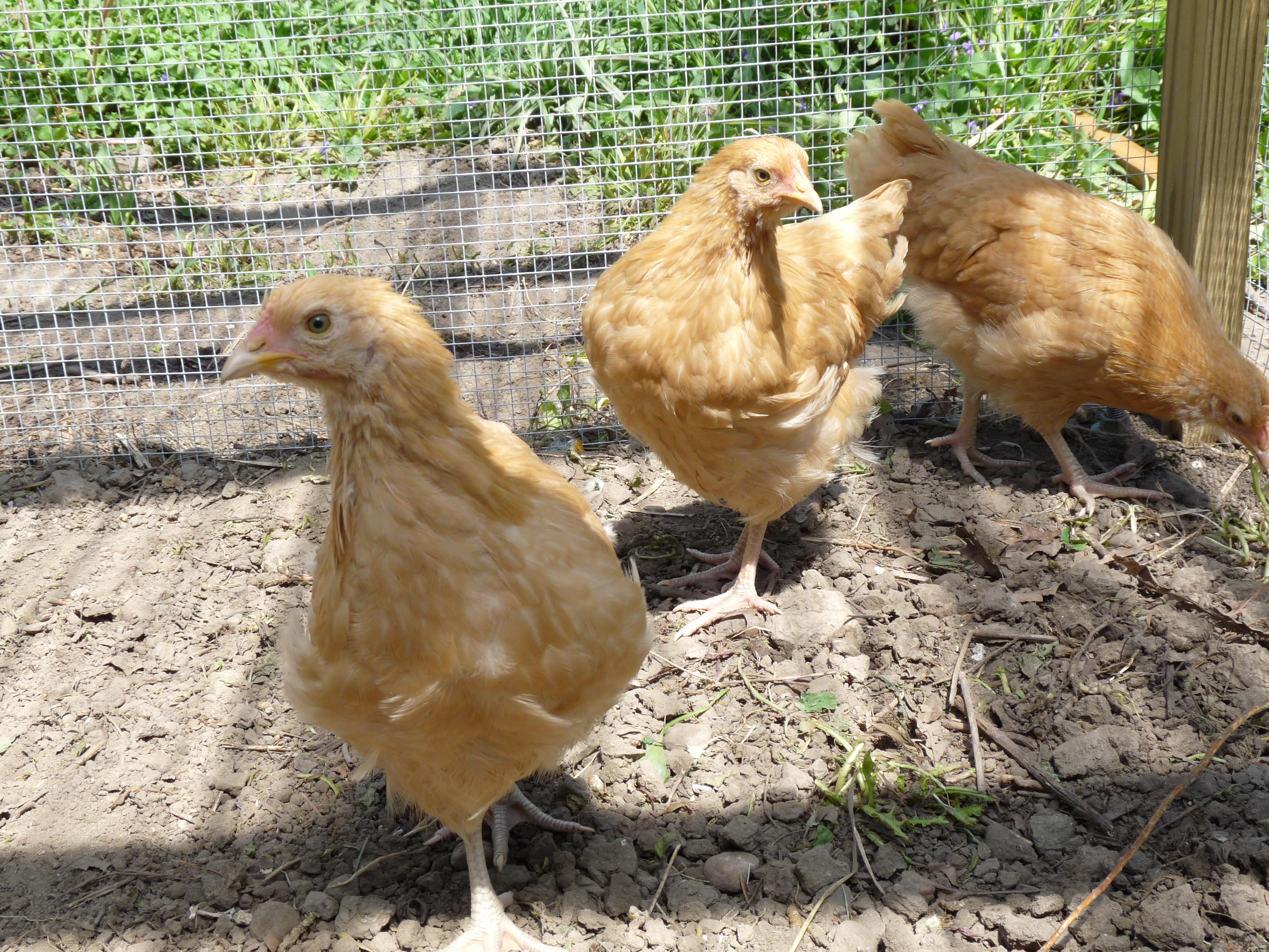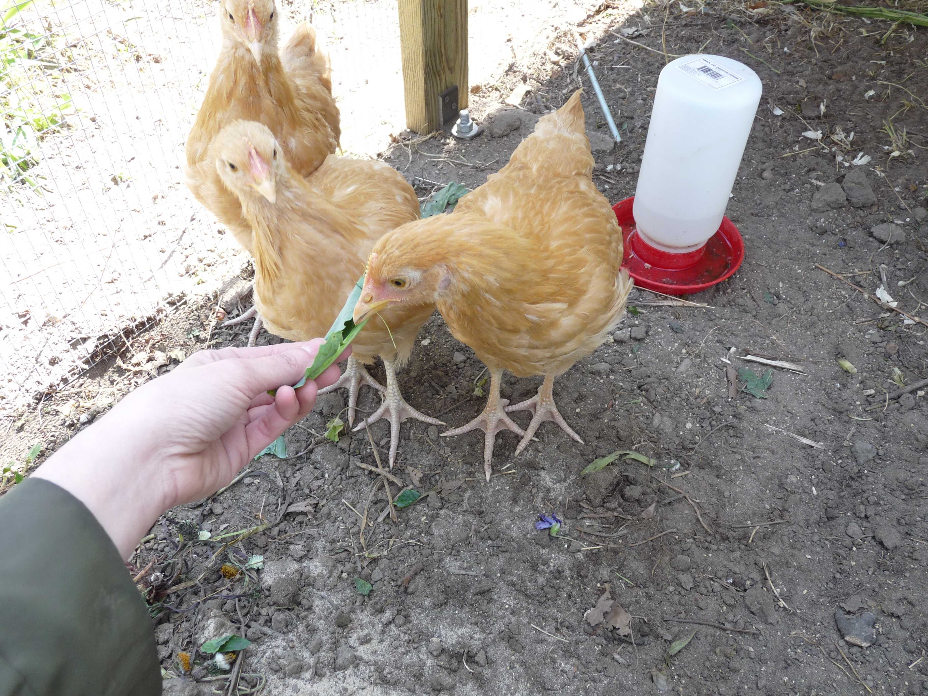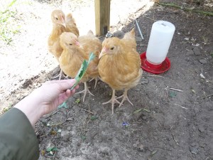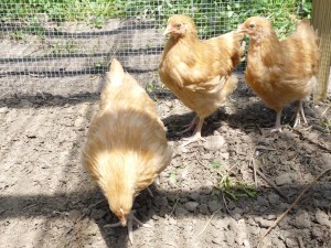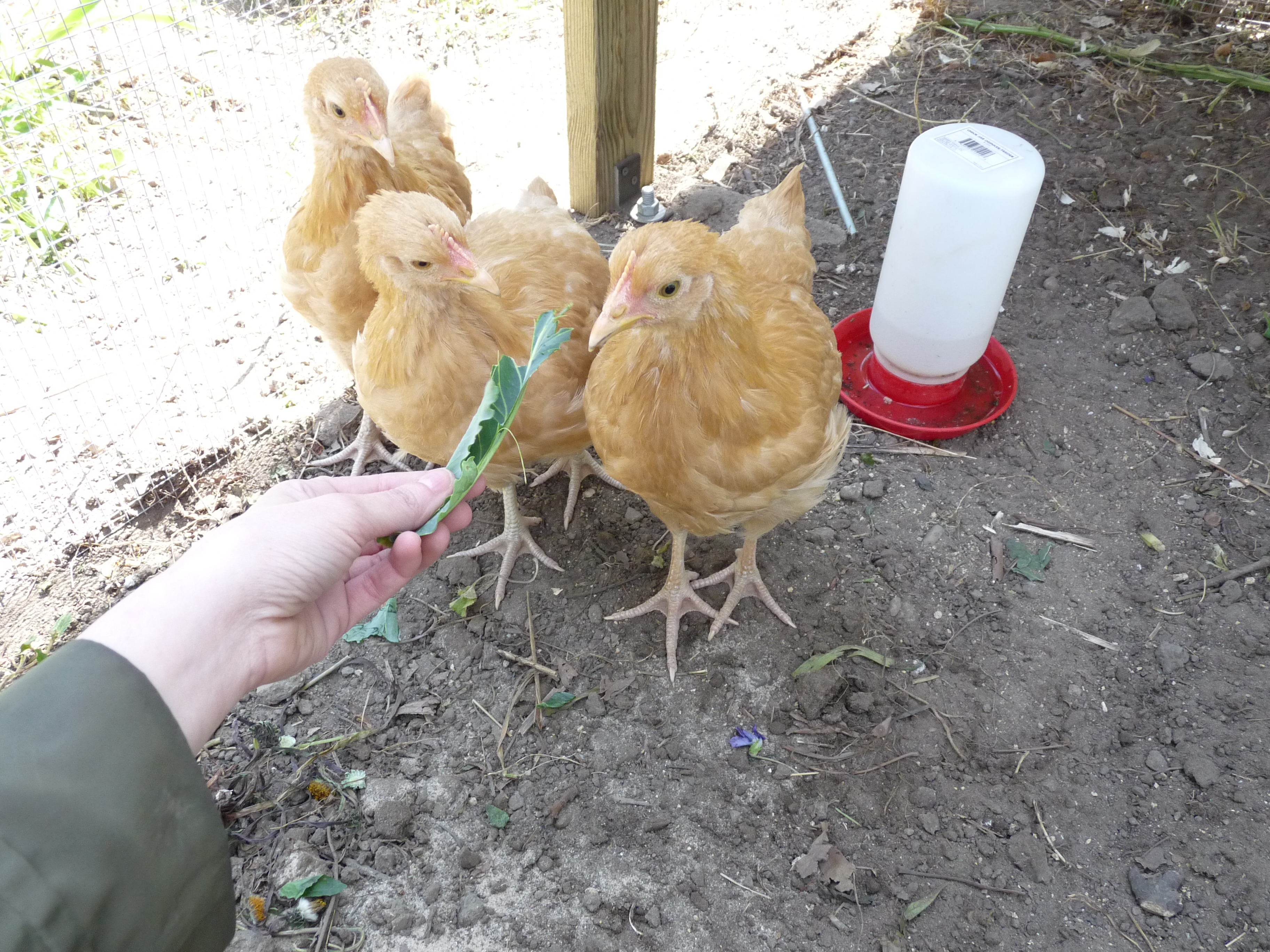 These girls are the fat orange cats of the chicken world, and as such are already getting a little spoiled.  They come running at the sight of me in the backyard, not out of affection, but because I usually have a delicious treat.  Lately it’s been dandelion greens, broccoli leaves, strawberries, and a tiny piece of ham.  I think they nearly lost their little chicken minds over that piece of ham.