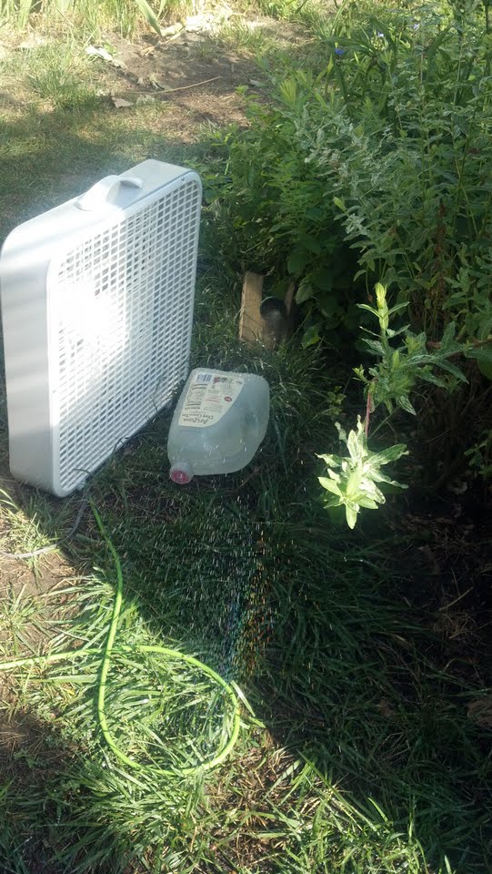 We made a simple evaporative cooler for the girls that seems to have helped in a major way.  I’ve been filling large bottles and jugs with water and freezing them solid- it makes your freezer run more efficiently to have them in there, and I’ve got them on hand to place in the coop run for the chickens to hang out nearby (not that they do, but even having it in the vicinity seems to help).  To make it, we place a box fan a short distance away from the run, placed the frozen jug in front of it, and angled my hose set to ‘mist’ so that the water hits the frozen jug and gets blown toward the run.  The cooled vapor travels into the shadey area under the coop, where the chickens like to hang out- I can FEEL that it’s cooler down there than it is in the surrounding yard.