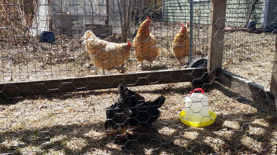 Chicks must be gradually introduced to older hens. In this case, we used a ‘chicken tractor’ to keep the two groups physically separated but able to see each other.